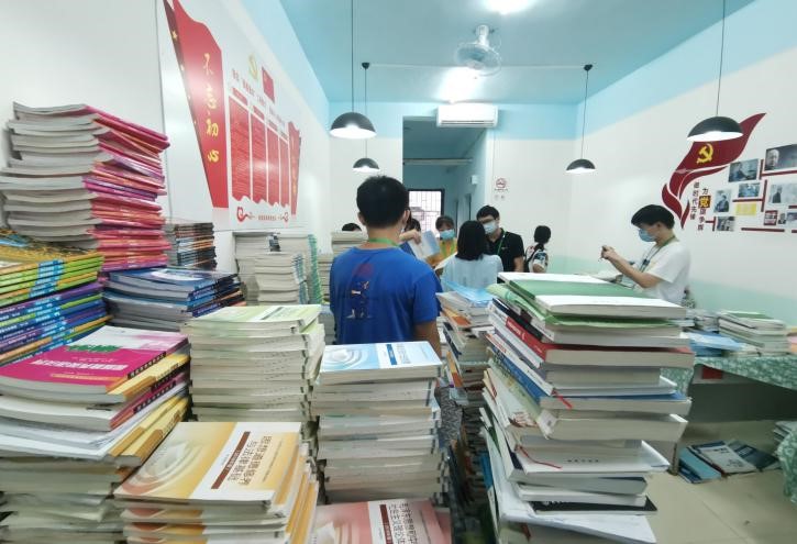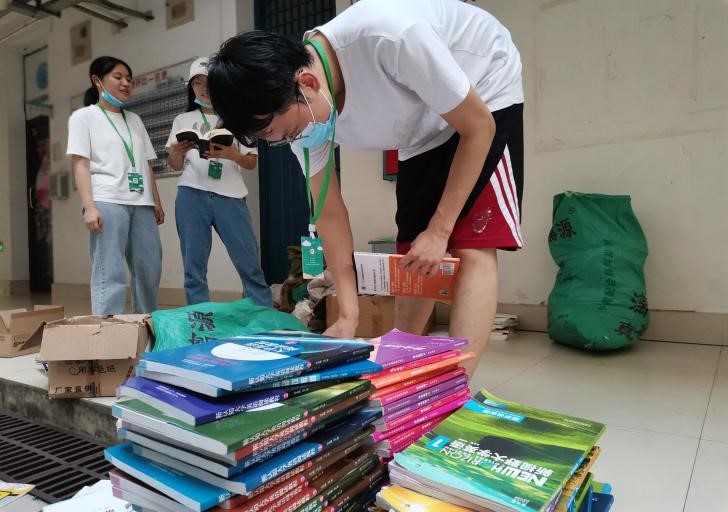 6月12日下午,自强社工作人员在24#103自习室设立旧书回收点。虽然六月天气炎热,但还是有着许多拿着沉甸甸的书籍积极参与活动的同学们。工作人员收到的不只是旧书,更是同学们的一份友爱和善心。6月13日下午,志愿者们集结完毕,与自强社工作人员分批到各个宿舍楼层回收旧书,并对旧书就行分门别类,整理成考研资料、四六级资料、专业课本和课外图书四类。
