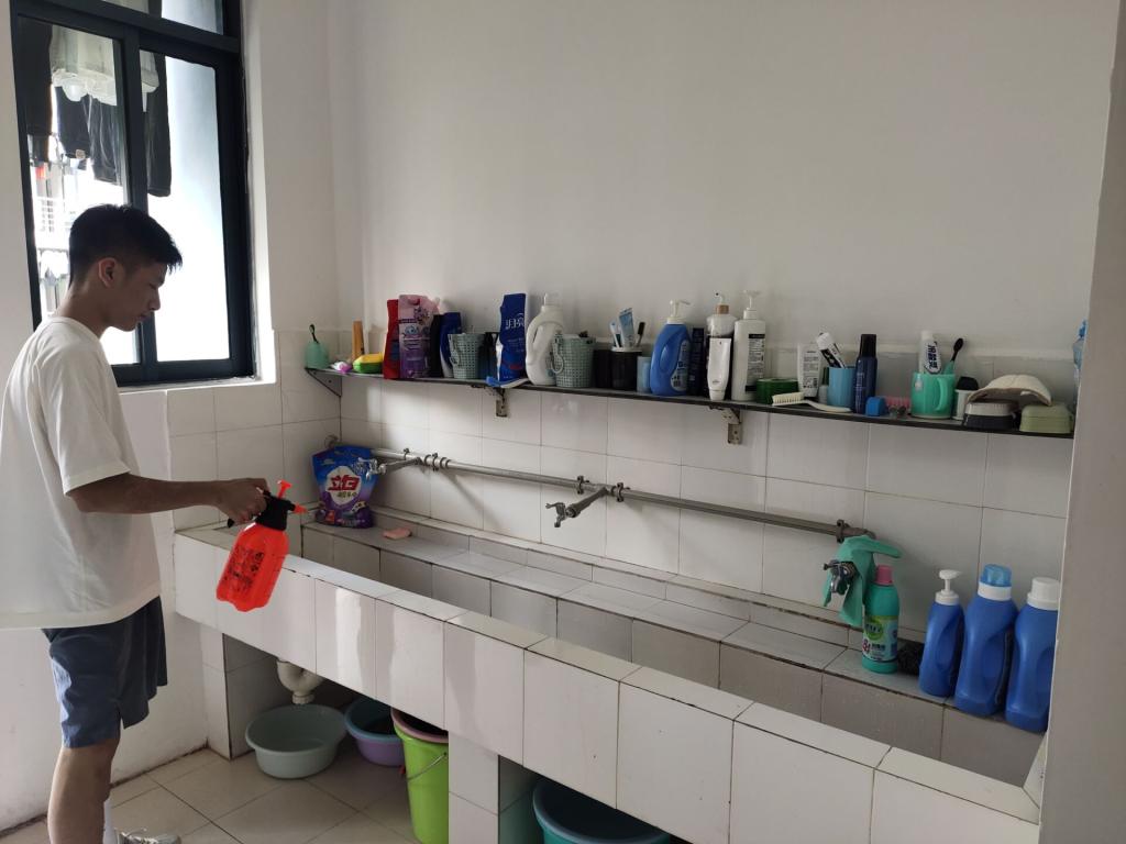 学生干部首先对“每日清洁制度”情况落实表进行了检查和更换,并督促学生每天按时填写表格信息。消杀过程中,参与的同学分为几个小组,除了对宿舍的门窗、床柜、水池等固定设施进行消杀,还对宿舍楼的走廊及楼梯等公共区域进行了消杀工作。同学们紧密配合,严格按照84消毒剂的配比进行喷洒,确保不留任何死角,为同学们创造安全、健康、卫生的学习生活环境。