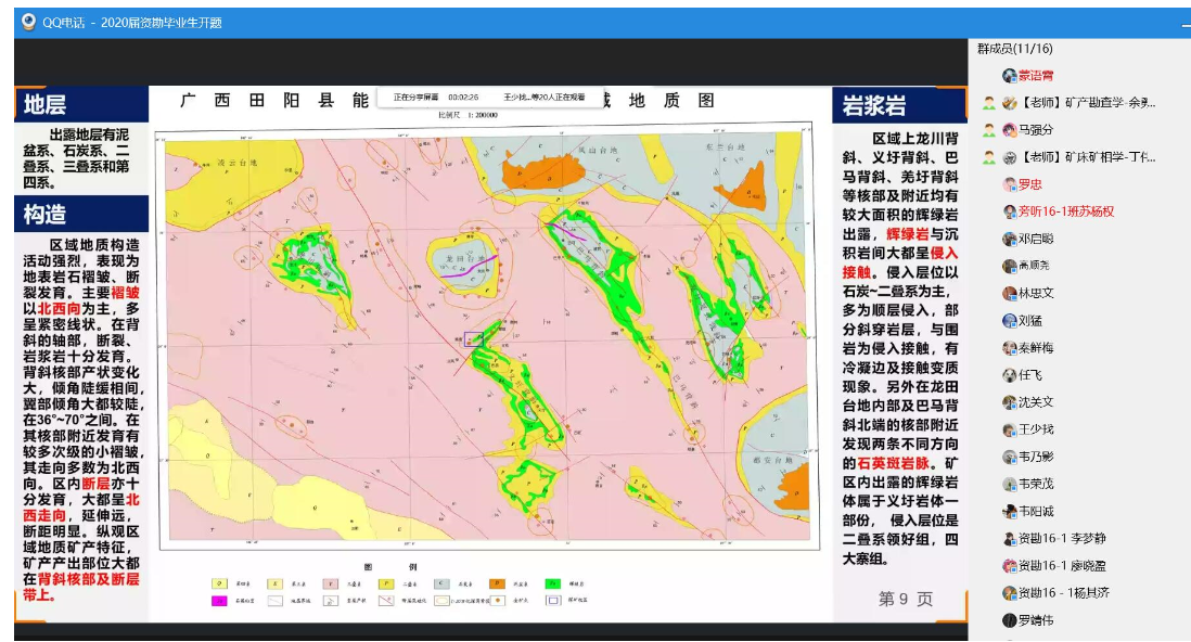 因新型冠状病毒疫情防控需要,学生暂无法返校。为了不影响2020届毕业生顺利毕业,根据学校和学院的要求,资源勘查工程教研室于2020年4月10日星期五上午利用腾讯QQ视频通话分享屏幕的方式组织2020届资源勘查工程专业本科毕业生进行了线上开题答辩。