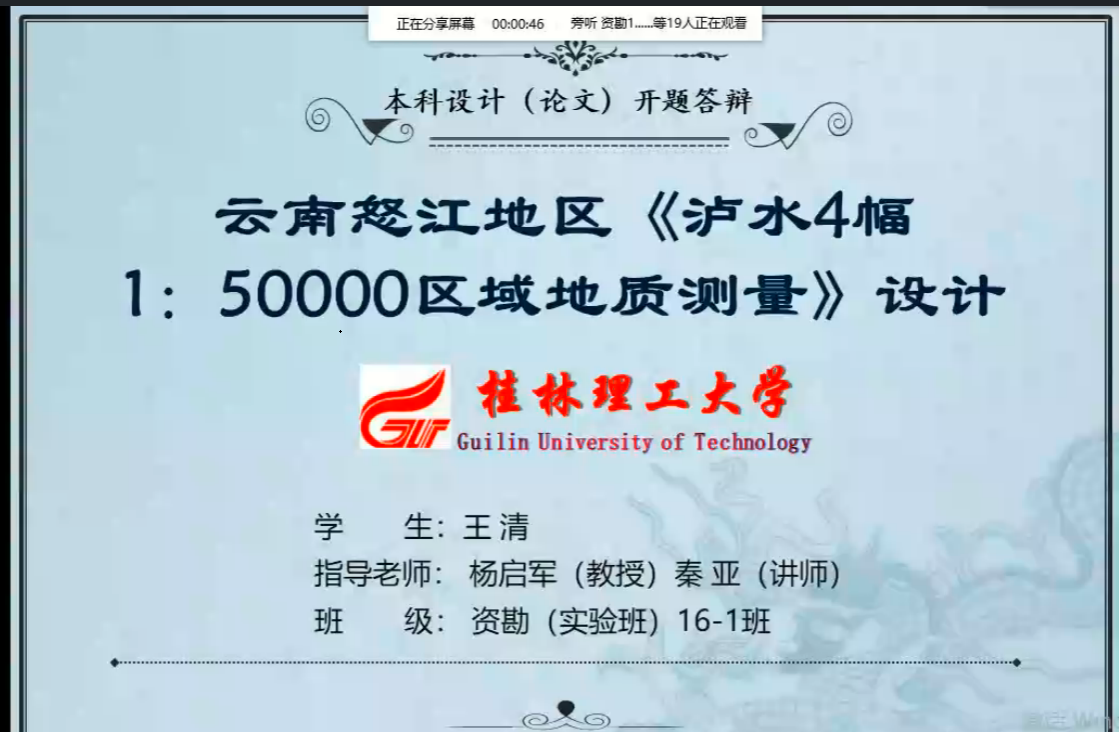 资源勘查工程专业2020届本科毕业生共计47人,根据开题答辩人数不低于30%的要求,本次共计抽选15人进行了开题答辩,为两组进行。4月9日,教研室负责人提前向学生公布了开题答辩的时间、抽选名单和开题答辩方式;并向学生和参与答辩的老师介绍了平台的使用和开题答辩的要点。