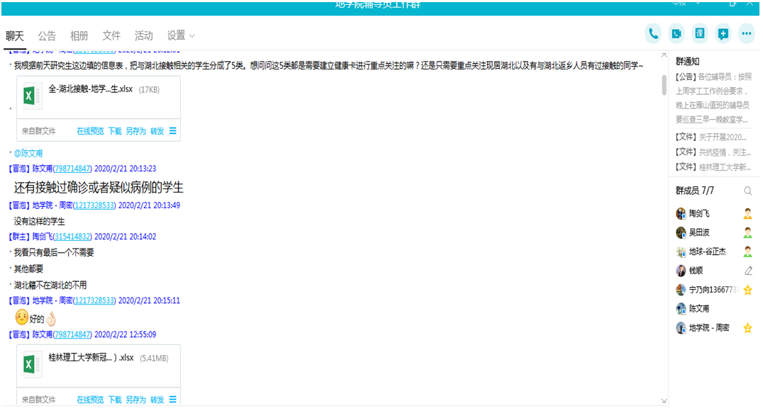 2020年2月21日上午,2138CC太阳集团党委副书记陶剑飞和学工办各年级辅导老师开展新学期学生工作会议,受新型冠状病毒感染的肺炎疫情影响,本次会议通过QQ群开展线上语音会议。会议的主要内容为学院学生疫情情况、返校准备等内容。