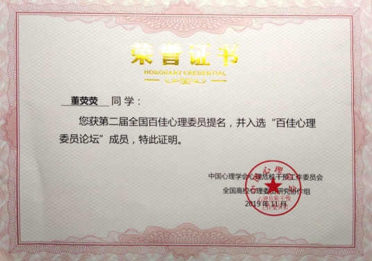 董荧荧同学从大一年级开始,一直担任班级心理委员,并曾任学校心理健康教育与咨询中心的朋辈助理和学校心理协会会长,努力提升专业素养,精诚服务同学,曾获第二届全国高校心理情景剧大赛二等奖、全区高校大学生525心理健康活动月“心理情景剧”二等奖等奖项。与此同时,董荧荧同学学业刻苦,曾获学校“三好学生”称号和一等奖学金。近年来,学院立足于学校心理健康工作的统筹部署,结合学院发展和具体学情,扎实推进朋辈心理服务培育工作,取得了一定成效。